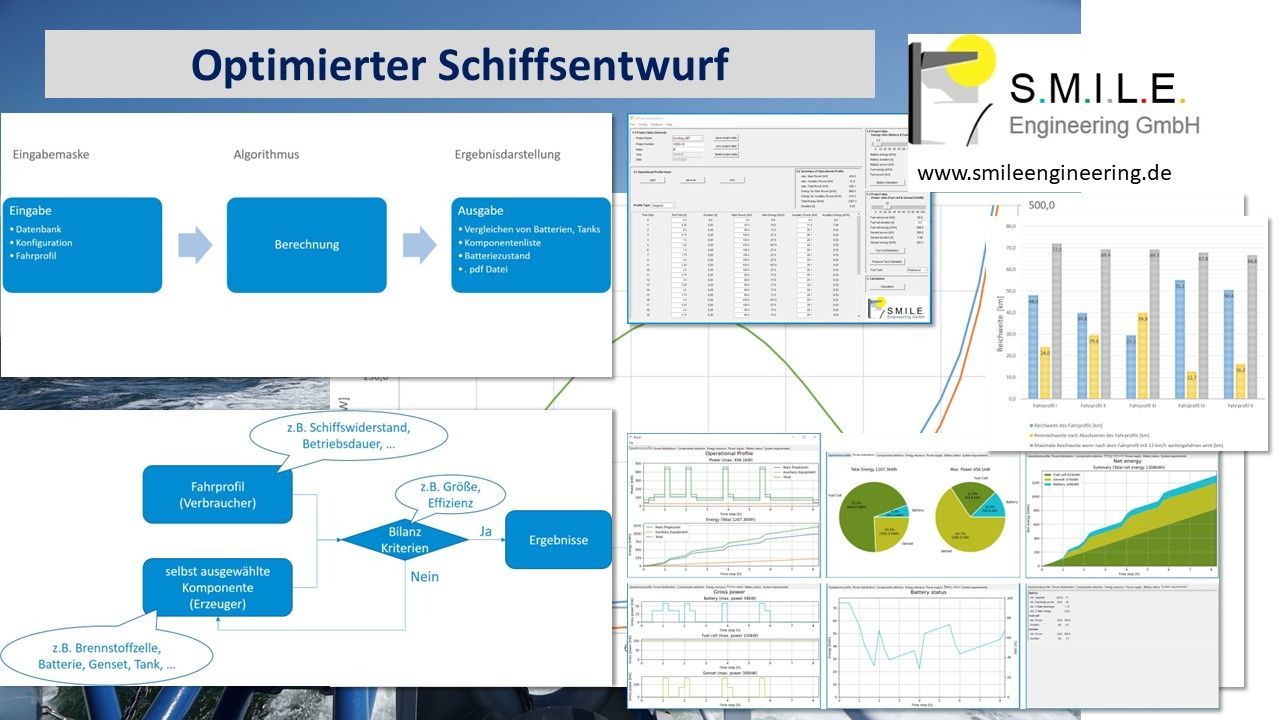 Im Rahmen des EcoShip60 ZIM Netzwerkes haben wir im Teilprojekt KBT eine Berechnungsmethode entwickelt und programmiert. Diese Methode dient der Dimensionierung von Antriebsanlagen mit den unterschiedlichsten Baiskomponenten. Es wird damit eine Optimierung der einzelnen Anlagenteile in Abhängigkeit zum gewünschten Nutzerprofil vorgenommen. Also z.B. die Größe einer Brennstoffzelle, die Batteriemenge oder andere Anlagenteile in Abhängigkeit zueinander bestimmt. Dabei werden auch verschiedene Kraftstoffe wie Wasserstoff oder Methanol berücksichtigt, und ein Vergleich zu einer klassischen Dieselantriebsanlage ist ebenfalls möglich.