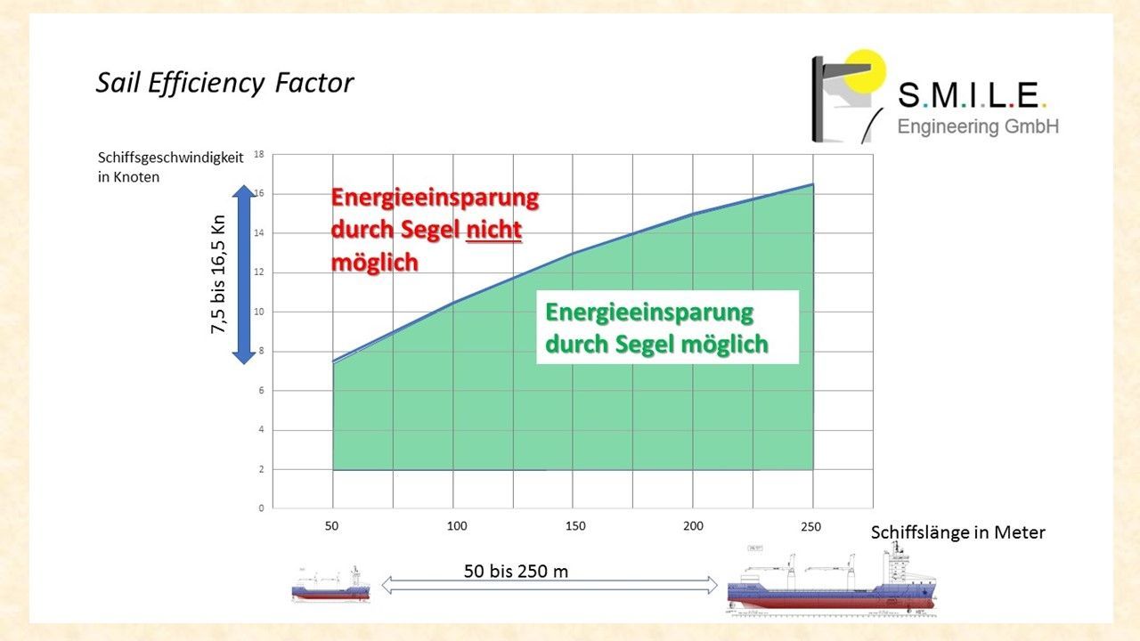 Anhand unserer Berechnungen können wir eine generelle Abschätzung geben bei welchen Schiffsgrößen und welchen Schiffsgeschwindigkeiten eine Energieeinsparung durch Segel bei Frachtschiffen möglich ist. Das ist bezogen auf die technischen Voraussetzungen, nicht auf die Wetterbindungen und Kurse, also die tatsächliche Reise.